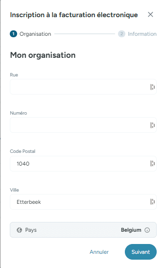 Si vous répondez à toutes les conditions, un pop up s’affichera automatiquement sur votre écran lors de votre prochaine connexion sur Skwarel pour réclamer votre identifiant Peppol.